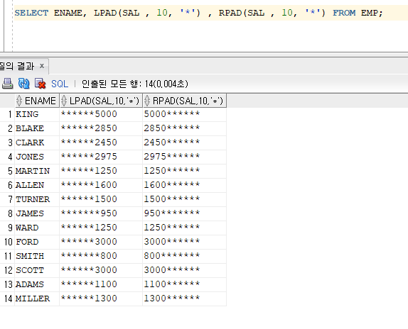 이름과 월급을 출력할 때 월급 컬럼의 자릿수를 10으로 하고, 월급을 출력하고 남은 나머지 자리에 *를 채워서 출력한다.