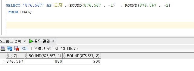ROUND(해당 숫자 , 반올림할 자릿수) - 해당 숫자를 자릿수만큼 반올림한 값을 보여준다.